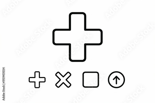 Fototapeta premium Plus icon set, add symbol, cross, check, delete, upload button on white...