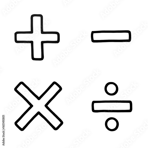 Fototapeta premium Plus, Minus, Multiply, Divide Symbols: Math Signs, Arithmetic Operators, Calculation Icons, Black and White, Graphic Design Elements
