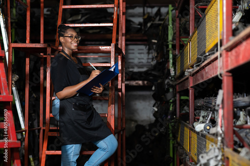 Obraz premium Plus size black female worker inspecting old car parts stock while working in...