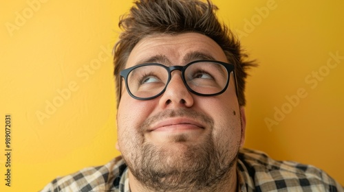 © PaulShlykov, Obraz premium Plus size man with beard standing over yellow background smiling looking up and thinking.