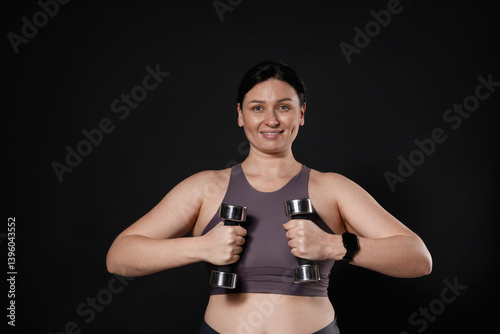 Fototapeta premium Plus size woman in gym clothes doing exercise with dumbbells on black background
