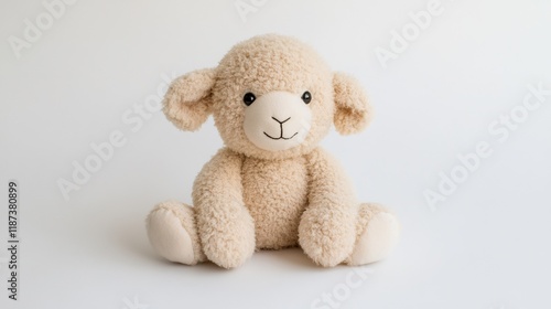 Obraz premium Plush lamb toy sitting, white background, studio shot, child's room decor