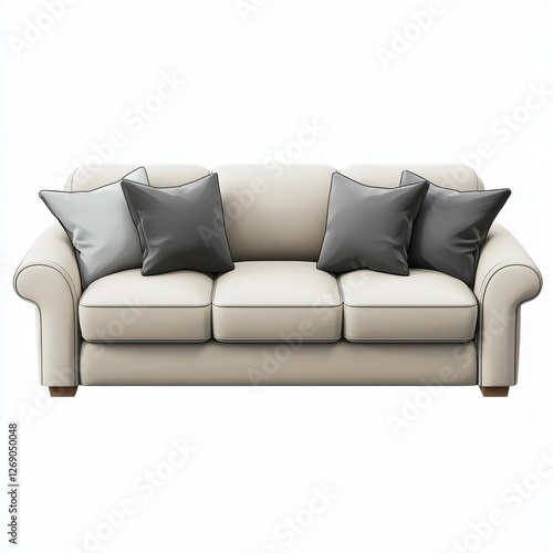 © Svitlana, Fototapeta premium Plush three-seater sofa with throw pillows isolated on white