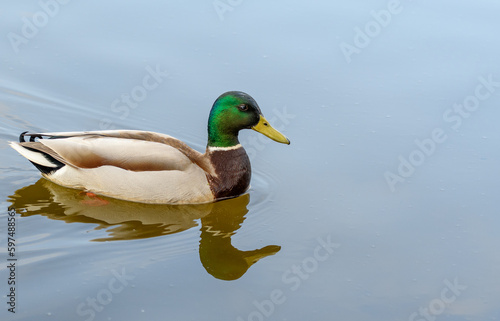 Fototapeta premium Pływająca kaczka odbijająca się na powierzchni wody