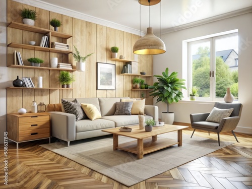 © kansak01, Fototapeta premium Plywood furniture pieces in a natural finish bring an organic touch to the space, while a geometric-shaped area
