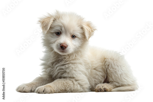 Obraz premium PNG Adorable fluffy white puppy lying down on white background