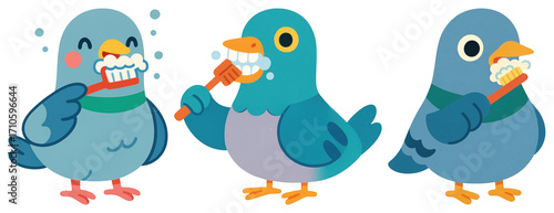 Fototapeta premium PNG Cartoon birds brushing teeth, element set on transparent background