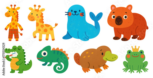 Naklejka premium PNG Colorful cartoon animal illustrations, element set on transparent background