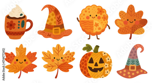 Fototapeta premium PNG Cute autumn-themed cartoon illustrations, element set on transparent...