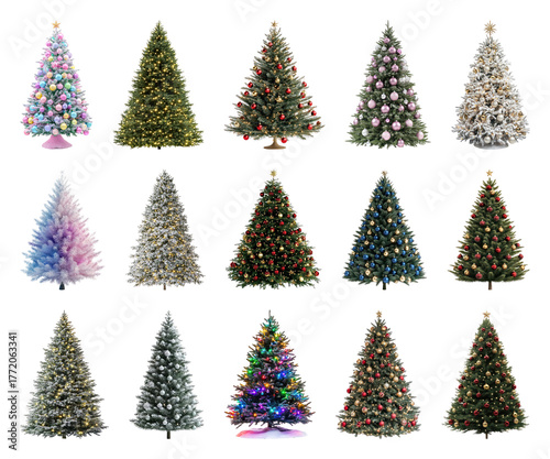 Naklejka premium PNG Festive colorful Christmas trees collection, element set on transparent...