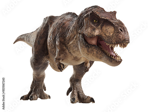 © Stock4u2024 , Obraz premium PNG file A fierce Tyrannosaurus Rex standing in a powerful stance. The dinosaur exhibits a realistic and imposing presence, with sharp teeth and detailed texture on transparent background PNG