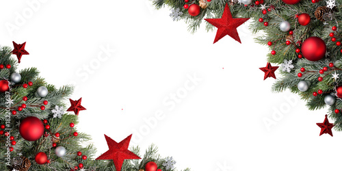 © towsif, Obraz premium Png image of Festive christmas background featuring pine branches red ornaments stars snowflakes and berries for holiday designs and seasonal greetings cards creation on transparent background