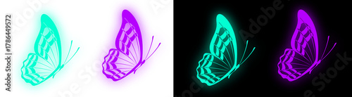 Obraz premium PNG Image of Neon butterfly set. Glowing cyan and purple insect icon. Bright...