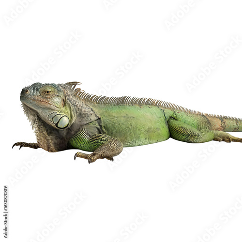 © PNGify, Fototapeta premium Png of A vibrant green iguana basking under soft lighting, showcasing its distinctive scales and calm demeanor.