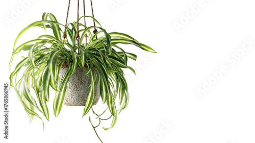 © Sam, Fototapeta premium PNG of A vibrant green spider plant gracefully cascading from a textured hanging pot.