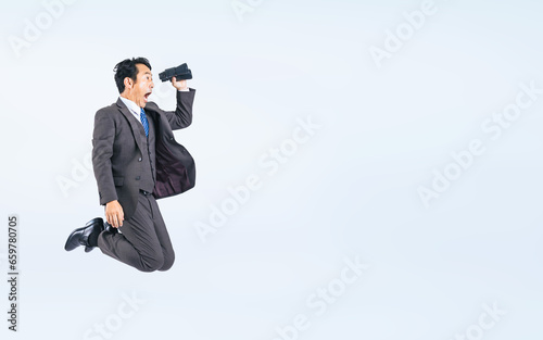 Fototapeta premium 双眼鏡を持ってジャンプする中年ビジネスマン(切り抜き背景透過PNGも販売しております。作成者リンクから「PNG」で検索してください)