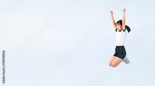 Fototapeta premium ジャンプする体操服を着た女の子(切り抜き背景透過PNGも販売しております。作成者リンクから「PNG」で検索してください)