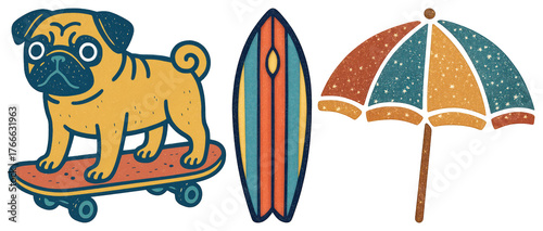 Fototapeta premium PNG Retro pug surfing adventure illustration, element set on transparent background