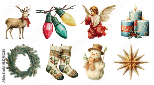 Obraz premium PNG Vintage Christmas festive decoration elements, element set on transparent...