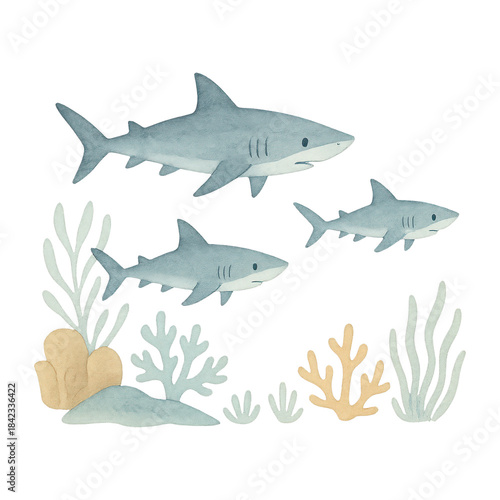 Obraz premium PNG Watercolor sharks swimming gracefully.
