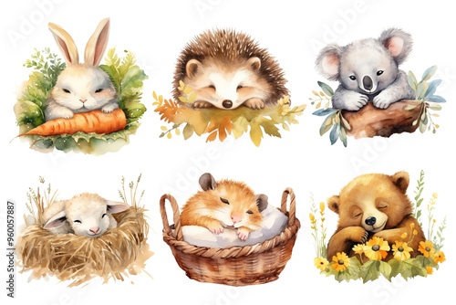 © Rawpixel.com, Fototapeta premium PNG Watercolor sleeping animal illustration element set, transparent background