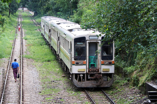 © Achisatha, Naklejka premium Pociąg jedzie po torze. za wieśniakiem Myanmarese idącym równoległym torem kolejowym.