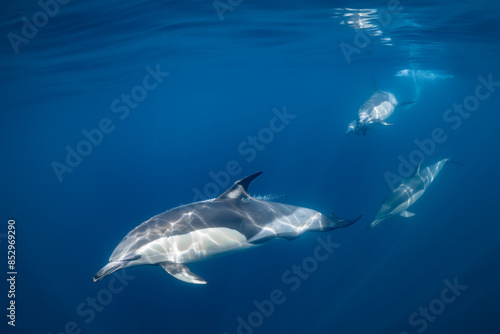 Fototapeta premium Pod of common dolphins (Delphinus delphis) swimming in the Atlantic Ocean...