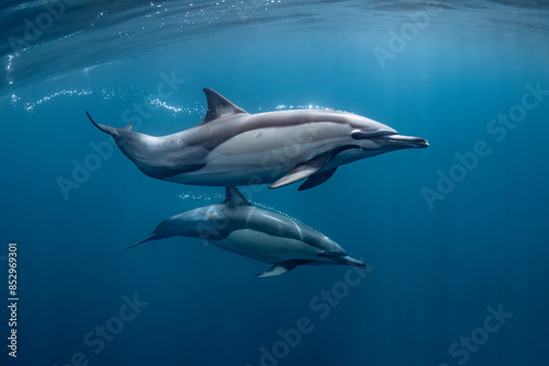 © Subphoto, Fototapeta premium Pod of common dolphins (Delphinus delphis) swimming in the Atlantic Ocean near the Western Cape coast of South Africa