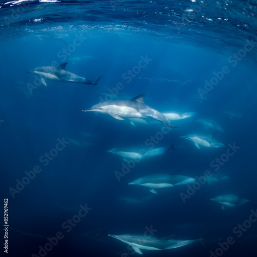 © Subphoto, Obraz premium Pod of common dolphins (Delphinus delphis) swimming in the Atlantic Ocean near the Western Cape coast of South Africa