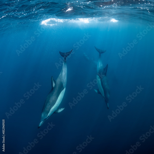© Subphoto, Fototapeta premium Pod of common dolphins (Delphinus delphis) swimming in the Atlantic Ocean near the Western Cape coast of South Africa