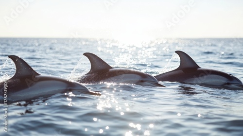 Fototapeta premium Pod of dolphins leaping together in the deep blue ocean during dolphin...