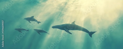 Obraz premium Pod of dolphins swimming freely in the sea lit by sunlight in the background for marine life articles