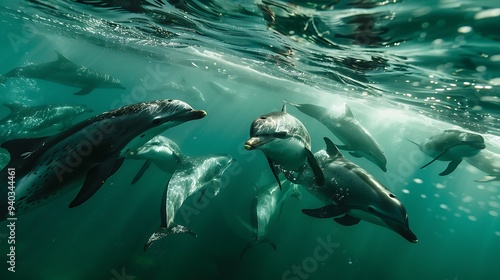 © improvee design, Fototapeta premium Pod of dolphins swimming in the ocean, captured from underwater with sunlight streaming through the water.