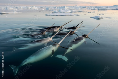 © Musfik, Fototapeta premium Pod of narwhals swimming in icy arctic waters at sunset