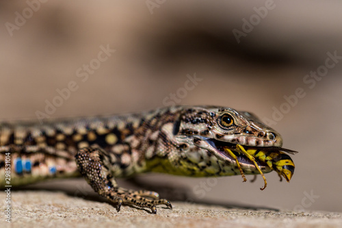 © saad, Obraz premium Podarcis muralis (pospolita jaszczurka ścienna) jedząca osę