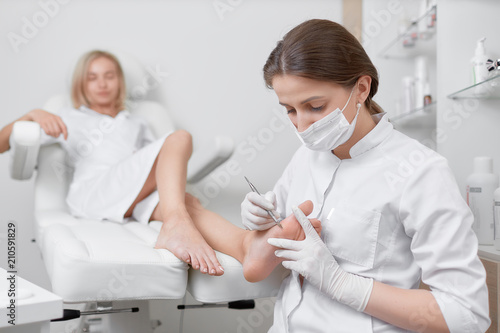 Fototapeta premium Podiatrist doctor caring about client foot with special iron tool.