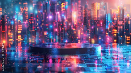 Fototapeta premium Podium in a vibrant, abstract cityscape with swirling lights, illustration background