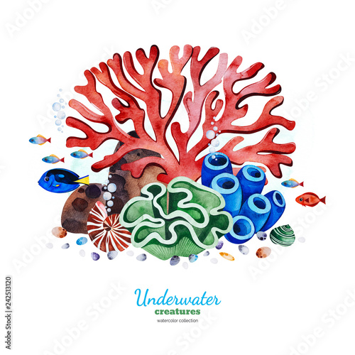 Naklejka premium Podwodne stworzenia. Akwarelowa kompozycja z wielobarwnymi koralowcami,...