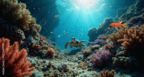 Fototapeta premium Podwodny świat raf koralowych. Grafika przedstawia bogactwo życia kryjące się w oceanach. Widzimy kolorowe rybki i stworzenia wodne. Na pierwszym planie znajduje się żółw morski.