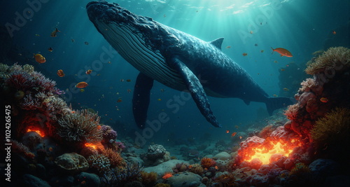 Obraz premium Podwodny świat raf koralowych w okolicach aktywnych sejsmicznie. Widoczne pęknięcia skał z wypływem gorącej magmy. Widzimy kolorowe rybki i stworzenia wodne. Na pierwszym planie wieloryb.