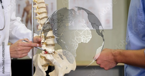 © vectorfusionart, Naklejka premium Pointing doctor in lab coat with stethoscope indicating vertebra on spine model in clinic, globe