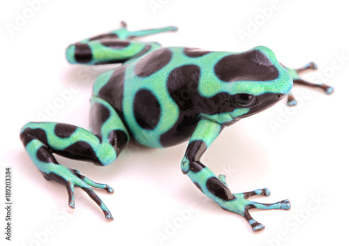 Obraz premium poison dart or arrow frog, Dendrobates auratus from the tropicla rain forest of Costa Rica and Panama isolated on a white background.