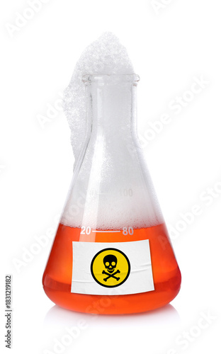 © New Africa, Obraz premium Poison in conical flask isolated on white. Laboratory glassware with skull and crossbones label