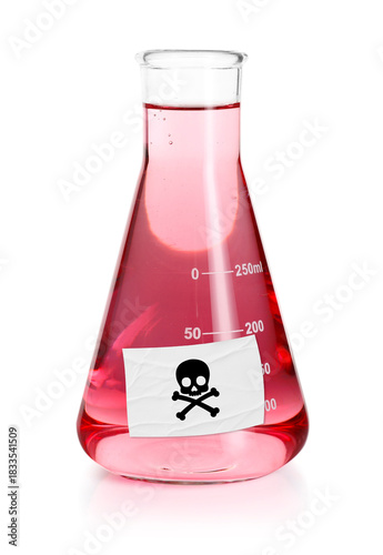© New Africa, Obraz premium Poison in conical flask isolated on white. Laboratory glassware with skull and crossbones label