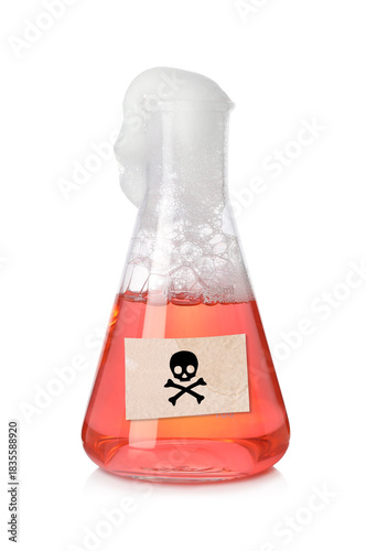 © New Africa, Naklejka premium Poison in conical flask isolated on white. Laboratory glassware with skull and crossbones label