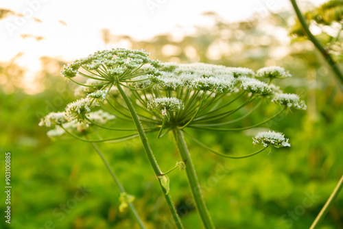 © finist_4, Naklejka premium Poisonous hogweed thickets in the field large umbels blooming