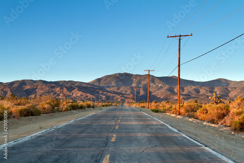 Fototapeta premium Pojedyncza wiejska droga na pustyni Mojave z widokiem na góry w porannej przejażdżce.