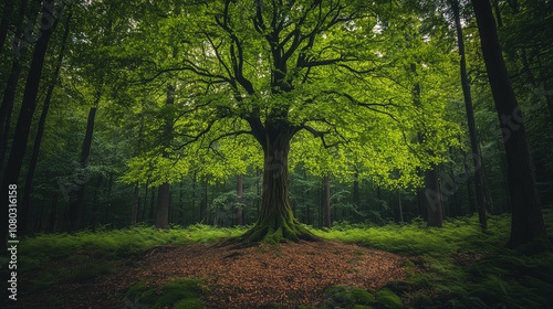 Naklejka premium Pojedyncze drzewo stoi pośród gęsto zalesionego krajobrazu, wypełnionego...