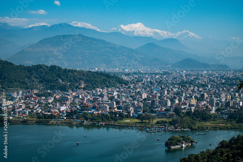 Fototapeta premium Pokhara city with turquoise lake and himalayas mountains in background