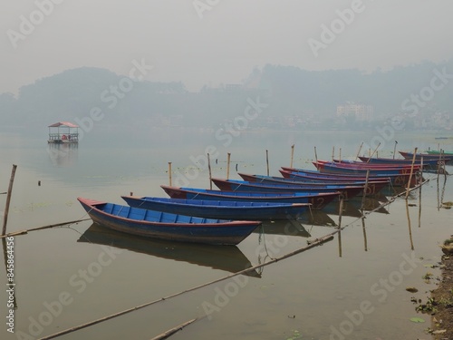 © Enrico Tricoli, Naklejka premium Pokhara: Phewa Lake. Series of small wooden boats all colored moored near the shore. In the background the Nepalese mountains, the fog and the reddish sun during sunset. The water of the lake is brown